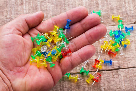 thumbtacks of colors on old wood top view