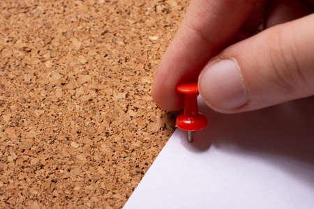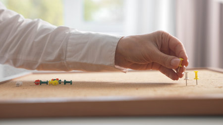 A person hand places a yellow pushpin among others on a corkboard. The scene is brightly lit, emphasizing organization.