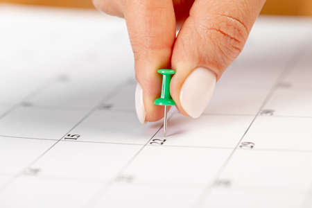 a woman's hand holds a green button to mark the date on a white calendar on the table