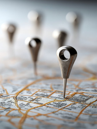 Bright metal markers accentuate key points on a detailed city map, aiding strategic planning and precise navigation across busy urban landscapes.