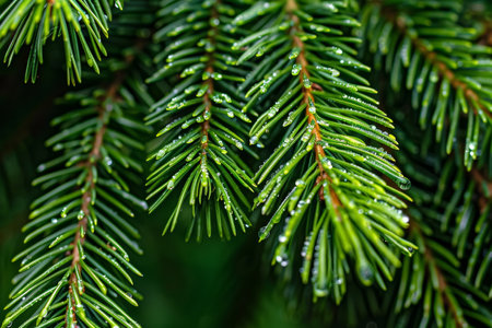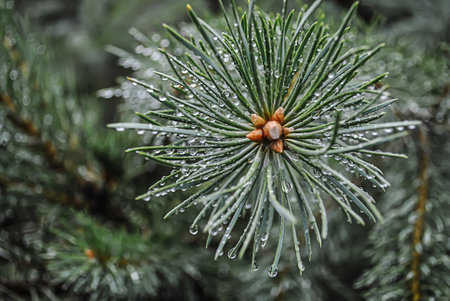 A macro shot capturing the vibrant green of evergreen needles adorned with pristine dew drops, evoking the freshness of nature after rainfall.