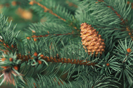 Golden pine cones on a fluffy green pine branch. Coniferous blurred background. Idea for coniferous design, screensaver. Winter card.
