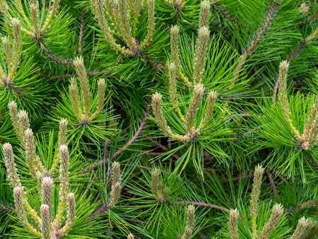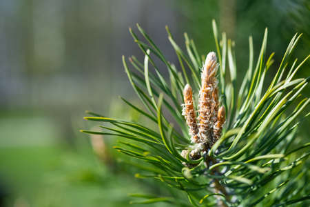 Pine branches with young buds in the rays of the evening sun. Medicinal plant landscape design