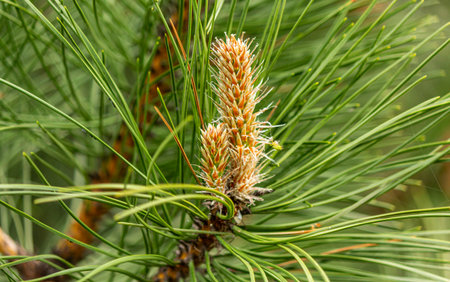 Young buds, flowers and pine shoots close up in the spring on a tree