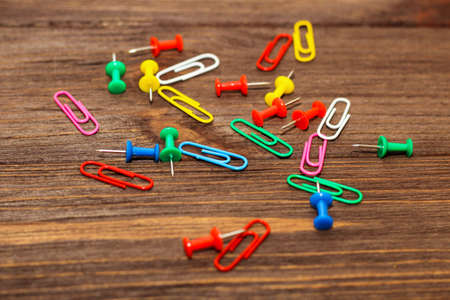 Set of various colorful paper clips on wooden desk. Many stationery office tools.