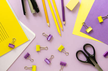 Back to school flat lay. Yellow and lilac stationery on a color background.