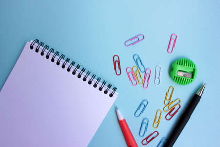Open paper notebook with a red pen, green pencil sharpener and colorful paper clips on blue background. Back to school concept. Flat lay, copy space