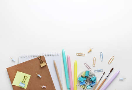Flat lay composition of notebooks, pens,pencil, binders,sticky notes, paper clips and brushes.Copy space,white background.Top view on various colorful stationery on desk. Creative workspace background.Back to school concept.