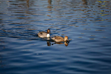 Two ducks northern pintail swimming in a pond, spring sunny day, Close up, male, female, pair Anas acuta on water, birds and animals in wildlife, selective focus, Adult Drake in full breeding plumage