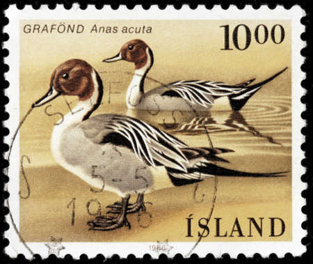 LUGA, RUSSIA - JANUARY 16, 2018: A stamp printed by ICELAND shows the pintail or northern pintail, circa 1986