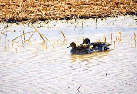 Green-winged teal ducks, Anas crecca, swim through the pond of Izumi Forest on a winter's morning. Shot at Izumi Forest, Yamato, Kanagawa Prefecture, Japan.