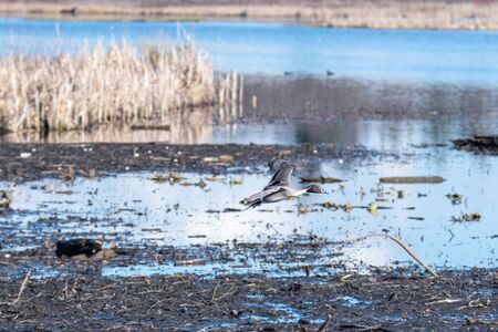 A male northern pintail duck Anas acuta flies over a lake in Canada.
