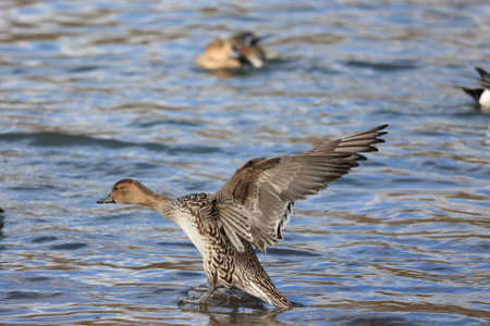Northern Pintail (Anas acuta) Hen on blue water.