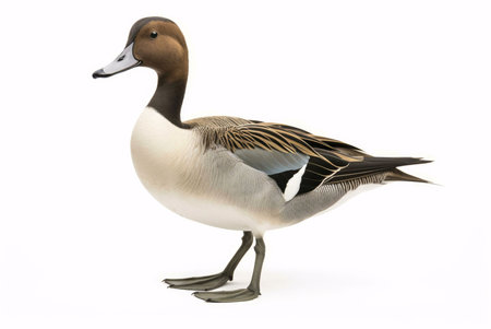 A northern pintail duck standing against a white background