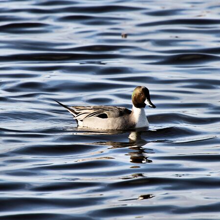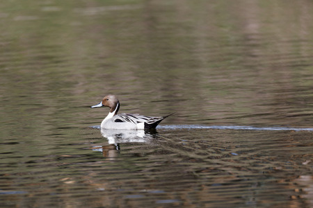 A male northern pintail duck, Anas acuta, swims through the pond on a November afternoon while wintering in Ueno Park, Tokyo, Japan.