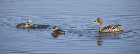 Yellow billed duck on a pond of blue water with two ducklings
