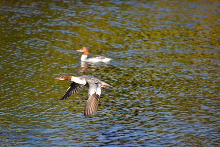A view of Common merganser flying in the air. Kyoto
