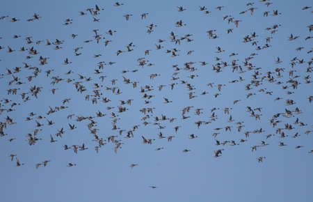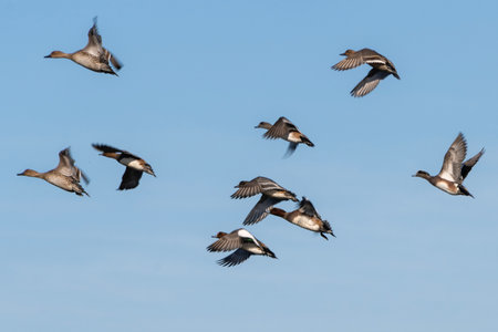 Flock of pintails flying with back of blue sky