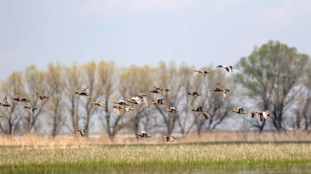 A flock of great crested teal (Anas crecca) in flight.