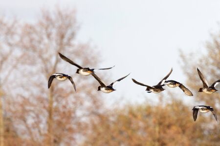 Closeup of a flock of tufted duck, Aythya fuligula, birds in flight.