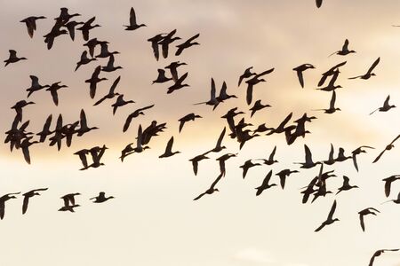 Flock of geese flying in the sky or a natural park in winter