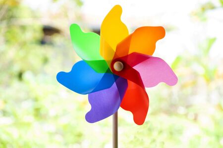 Colorful pinwheel and windmill toy made from plastic bottle recycle in garden at outdoor in Thailand
