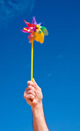 Hand holds rotating toy windmill over blue sky, copy space, slow shutter speed to catch motion