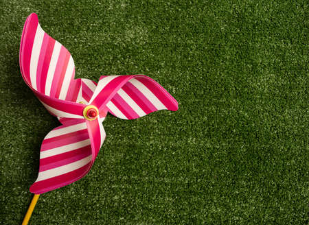 Colorful pinwheel toy on green grass background. Pinwheel wind spinner yard decor