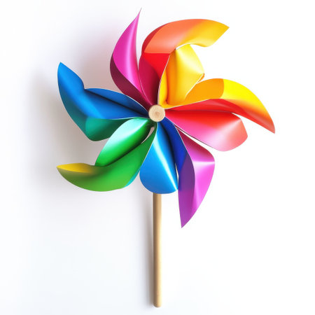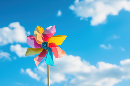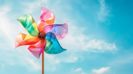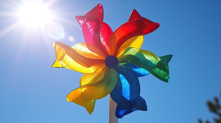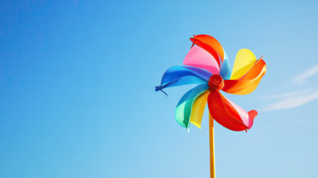 Bright and colorful pinwheel spinning in the breeze against a clear blue sky, symbolizing joy, summer, and childhood memories