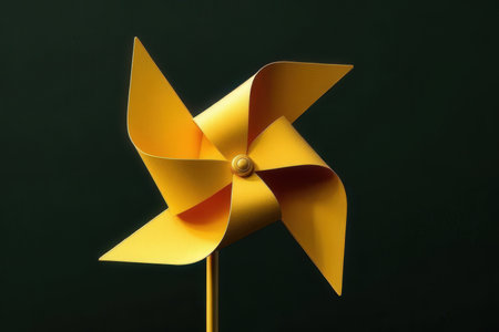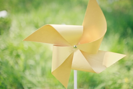 Windmill toy on yellow field background. Alternative energy concept