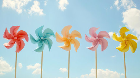Paper windmills in pastel colors arranged in a row, spinning against a bright sky with scattered clouds