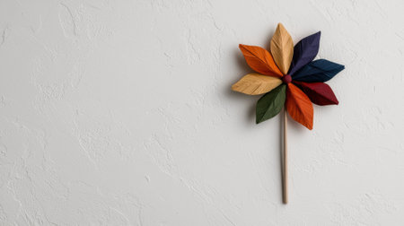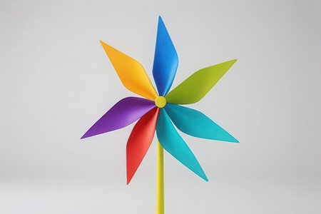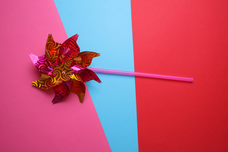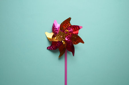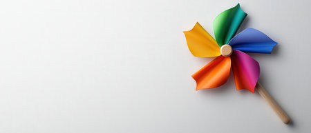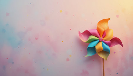 A vibrant pinwheel with colorful blades resting against a soft pastel background. Ideal for conveying themes of joy, playfulness, and childhood nostalgia.