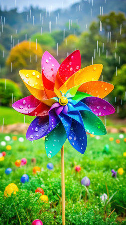 Colorful toy windmill in the garden with rain drops on it