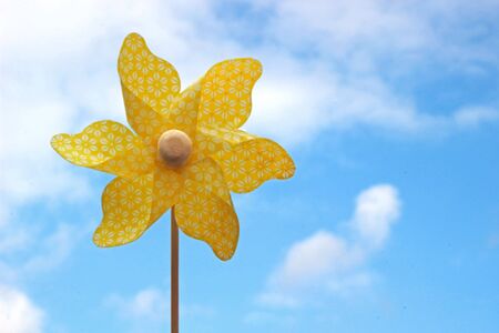yellow pinwheel toy in front of blue sky with some white clouds