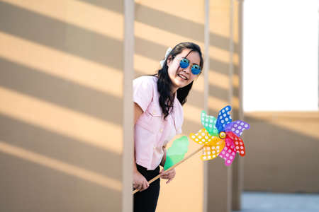 Asian woman posts and play Windmill Toy colourful rainbow colour on the building rooftop in sunset time.