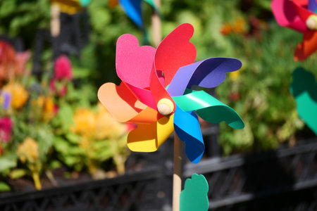 Colorful pinwheel spins in bright garden setting