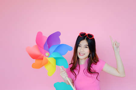 Portrait beautiful asian teen girl wearing pink dress on pink background, fashion summer set with colorful wind turbine or pinwheel or wind toy holding in hand, emotions action, happy life concept