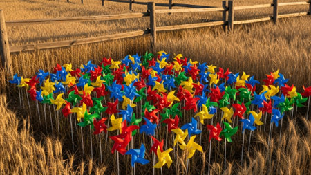 Colorful pinwheels in a sandbox inspire creativity and crafting in children during playtime and exploration. Generative AI