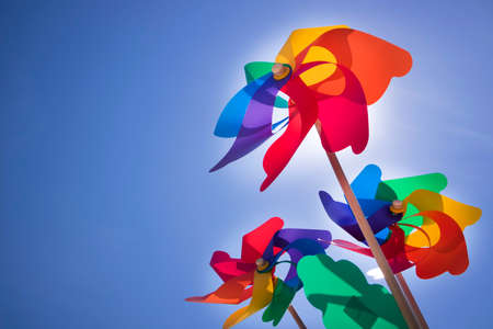 Colorful toy pinwheels with blue sky background