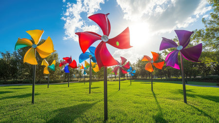 A collection of vibrant pinwheels spinning in the breeze at a sunny park.