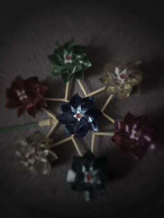 Red and yellow pinwheel in a row on the background of a wooden wall