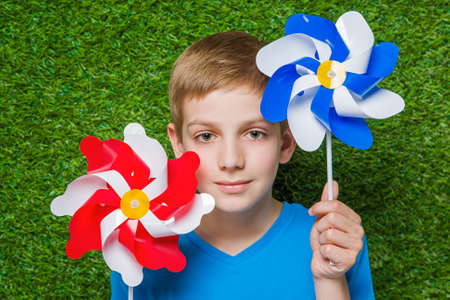 Smiling boy holding pinwheels over grass close up