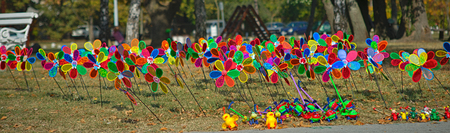 Pinwheels commemorating Child Abuse Prevention Month at the popular Audubon Park in New Orleans, Louisiana.