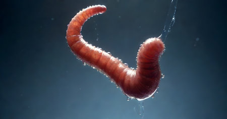 An earthworm floats gracefully underwater, captured in a serene moment with water droplets surrounding its elongated body. AI generation