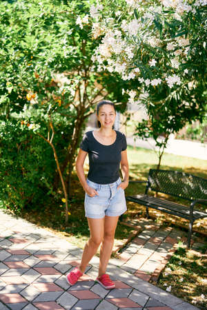 Portrait of a girl. A woman with long hair walks down the street. Beautiful brunette.