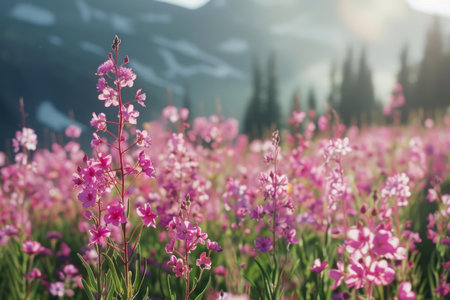 Tranquil and serene alpine meadow with vibrant pink wildflowers blooming at sunset amidst the stunning mountain range. Perfect for travel destinations and outdoor nature photography