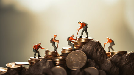 Miniature people. Climbers are climbing coins. Success business concept. business concept. Generative AI