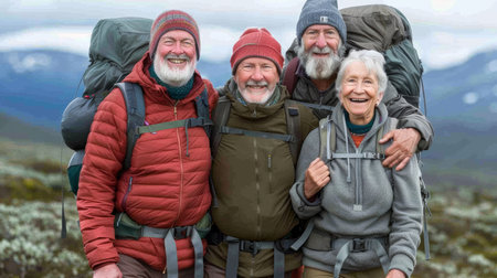 A group of diverse individuals stands triumphantly on the summit of a majestic mountain, taking in the expansive view.