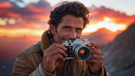 Smiling photographer capturing breathtaking sunset view atop a mountain landscape