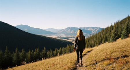 Young woman hiker walking on a mountain trail. Beautiful landscape in the mountains.
